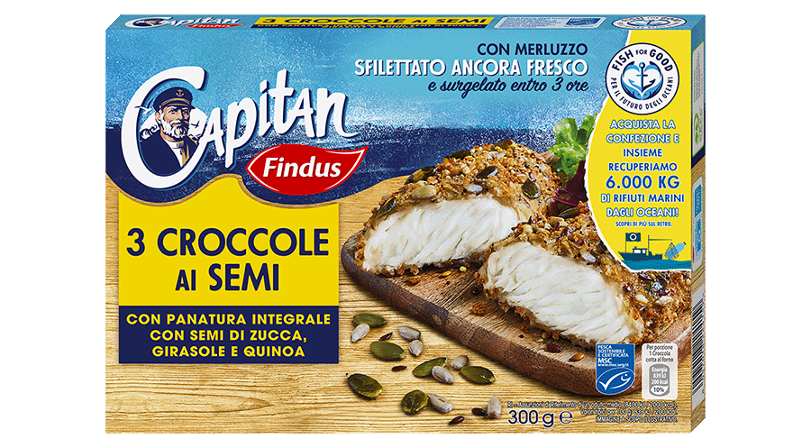 Le Croccole ai Semi costituite al 100% da filetti di Merluzzo (Theragra chalcogramma) o (Merluccius productus)(da pesca sostenibile e certificata) avvolti in una panatura integrale arricchita con semi di zucca, semi di girasole, lino e quinoa, secondo i dettami della recente “mania” per i semi oleosi estesa ai contesti più diversi. Un tratto differenziante sottile, ma cocente nelle scelte dei consumatori.