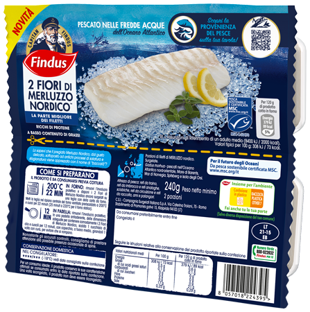 .I 2 Fiori di Merluzzo Nordico, (Gadus morhua) ottenuti dalla parte dell’animale catturato sempre da pesca sostenibile. Si presentano in una interessante confezione ricca di informazioni facilmente leggibili.