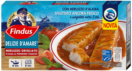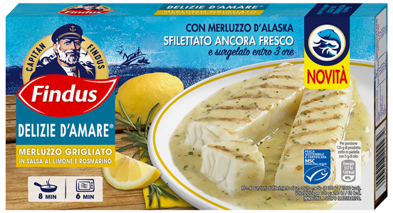 filetti di Merluzzo d’Alaska sfilettato ancora fresco pregriliato e surgelato entro 3 ore. E’ un ready-to heat di immediata preparazione in padella e una banalissima rifinitura con olio (per non dare, com’è ben noto l’idea del prodotto cotto & mangiato).