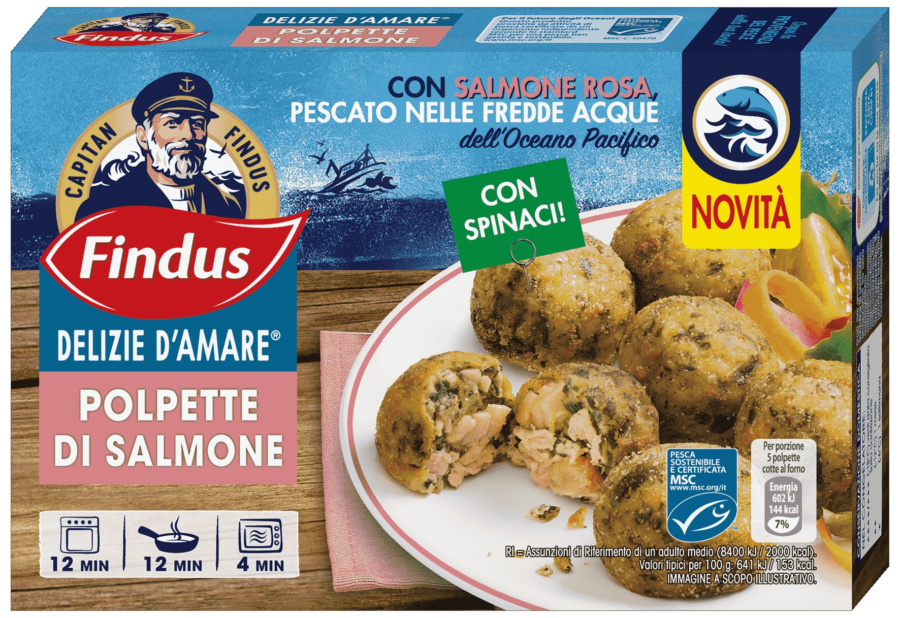 Le Polpette di Salmone Delizie da Amare che combinano briciole di salmone rosa (Oncorhynchus gorbuscha) con spinaci tritati al 29% , olio vegetale di colza, cipolla, olio vegetale di semi di girasole, fibra di piselli, amido di mais, sale, noce moscata in polvere, succo di limone da concentrato, destrosio, lievito.