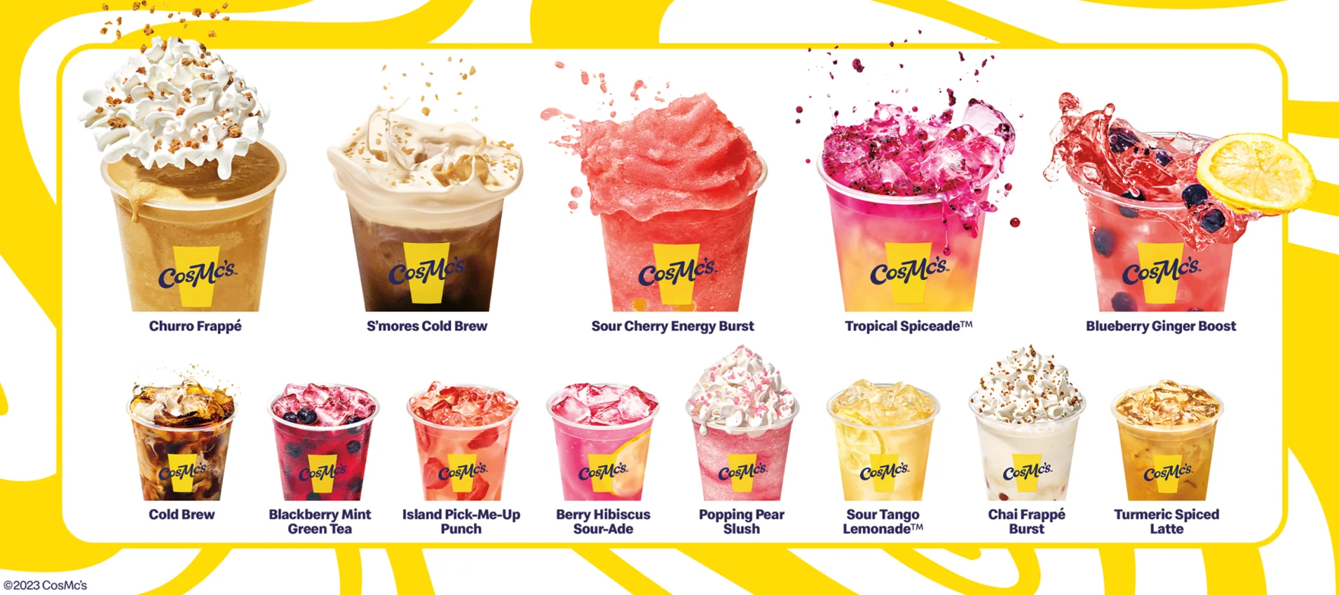 L’aspetto più innovativo del progetto CosMc’s è tuttavia il menù che non prevede Big Mac e patatine. Nella lista figurano piuttosto bevande con gusti molto trendy, quali granite di pere, churro frappé, cold brew frappé, S’Mores Cold Brew, island pick-me-up punch (una Limonata potenziata con frutti di bosco e fragole essiccate), tè verde alla menta e mora e boba (bubble tea).