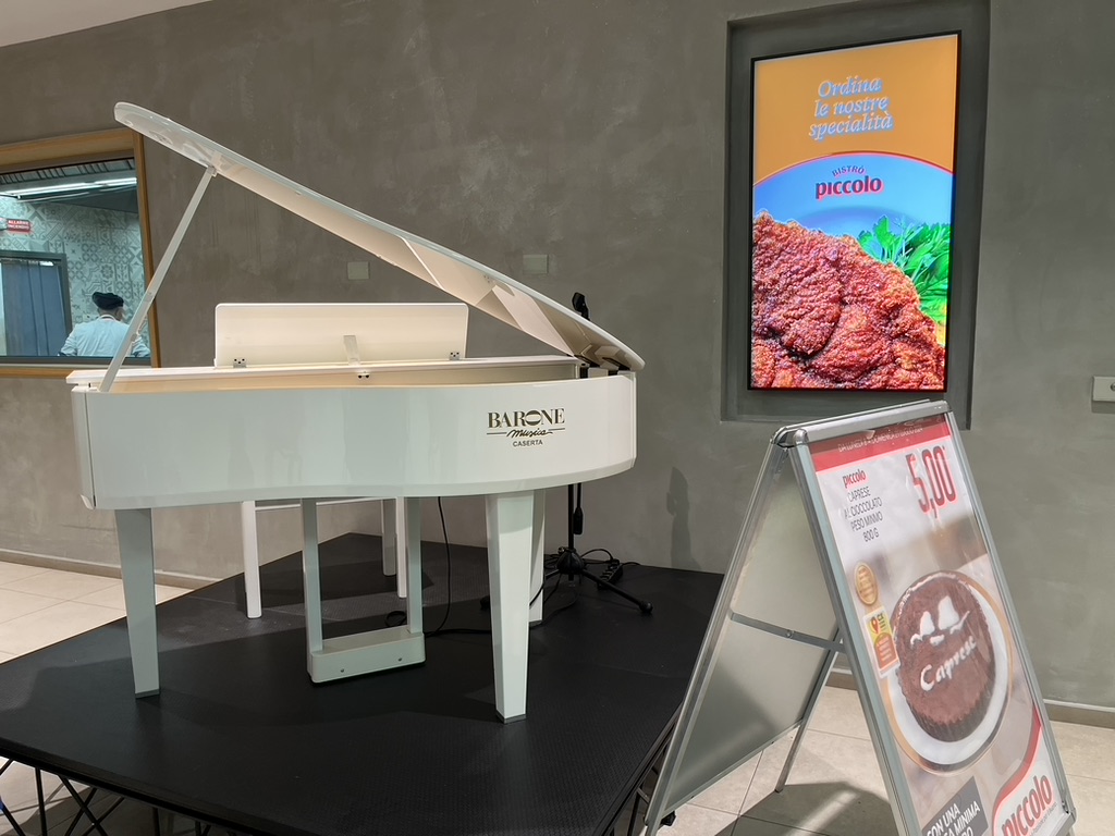 Infatti nel supermercato Piccolo è stato installato un pianoforte (bianco) per allietare i clienti.