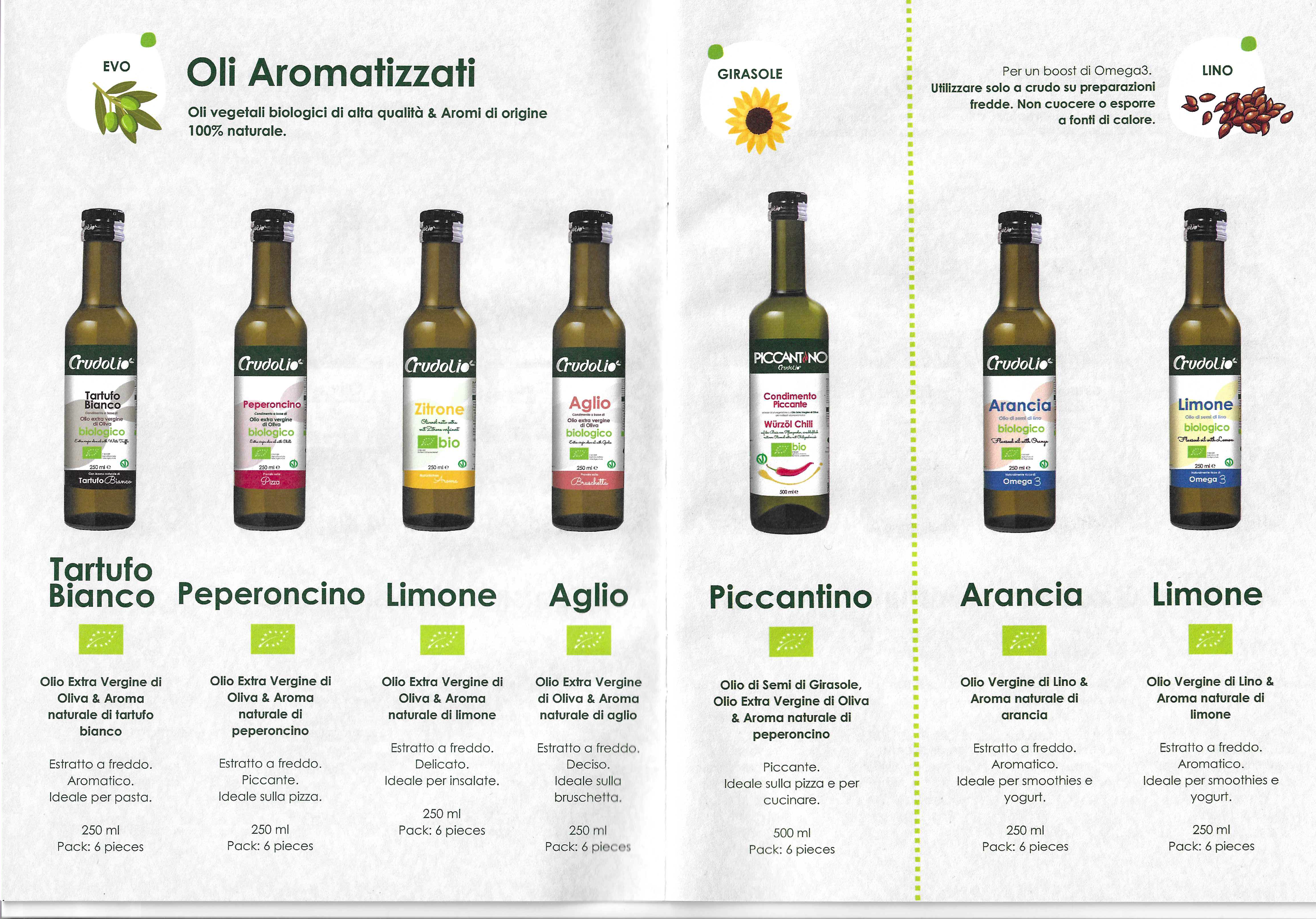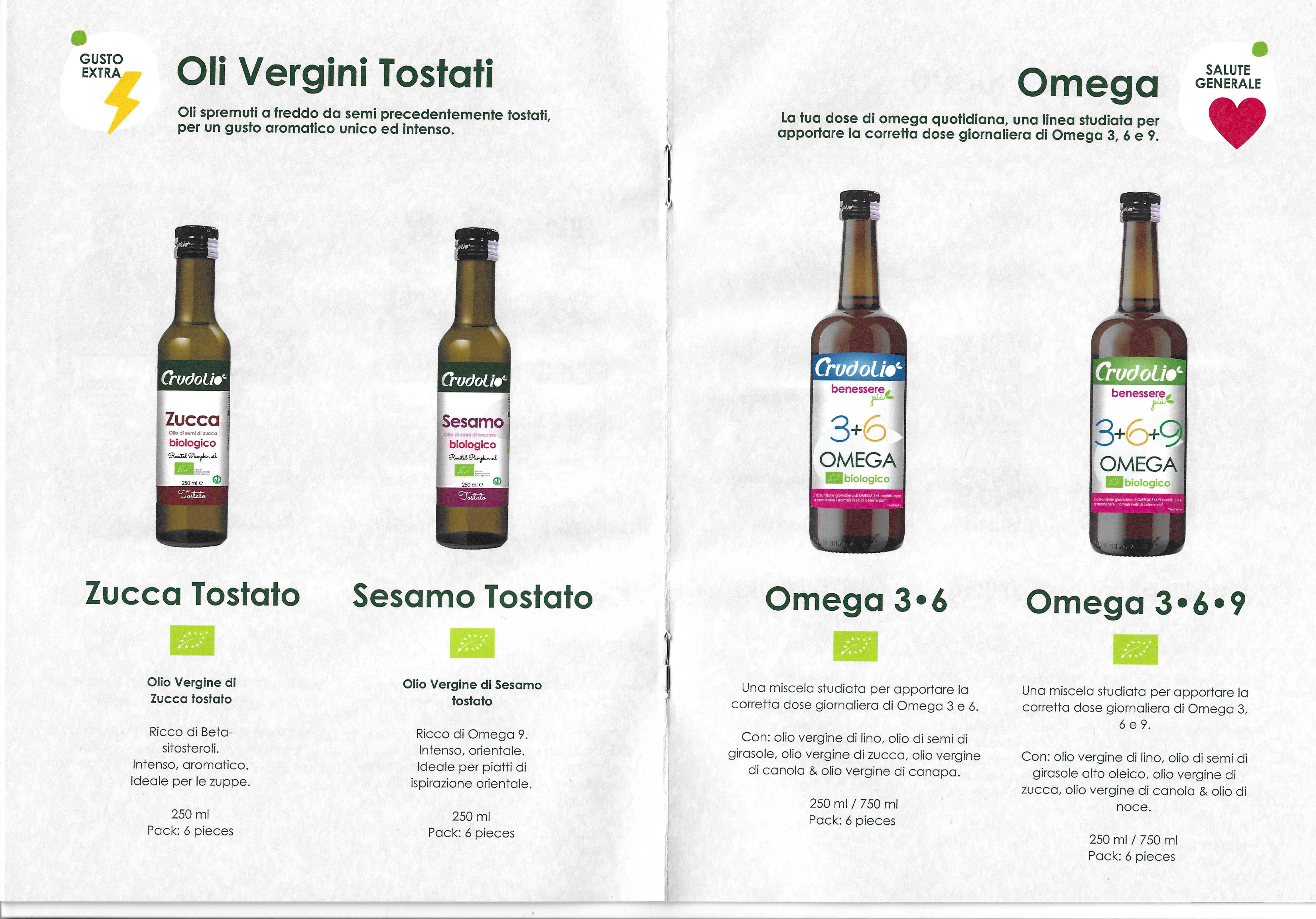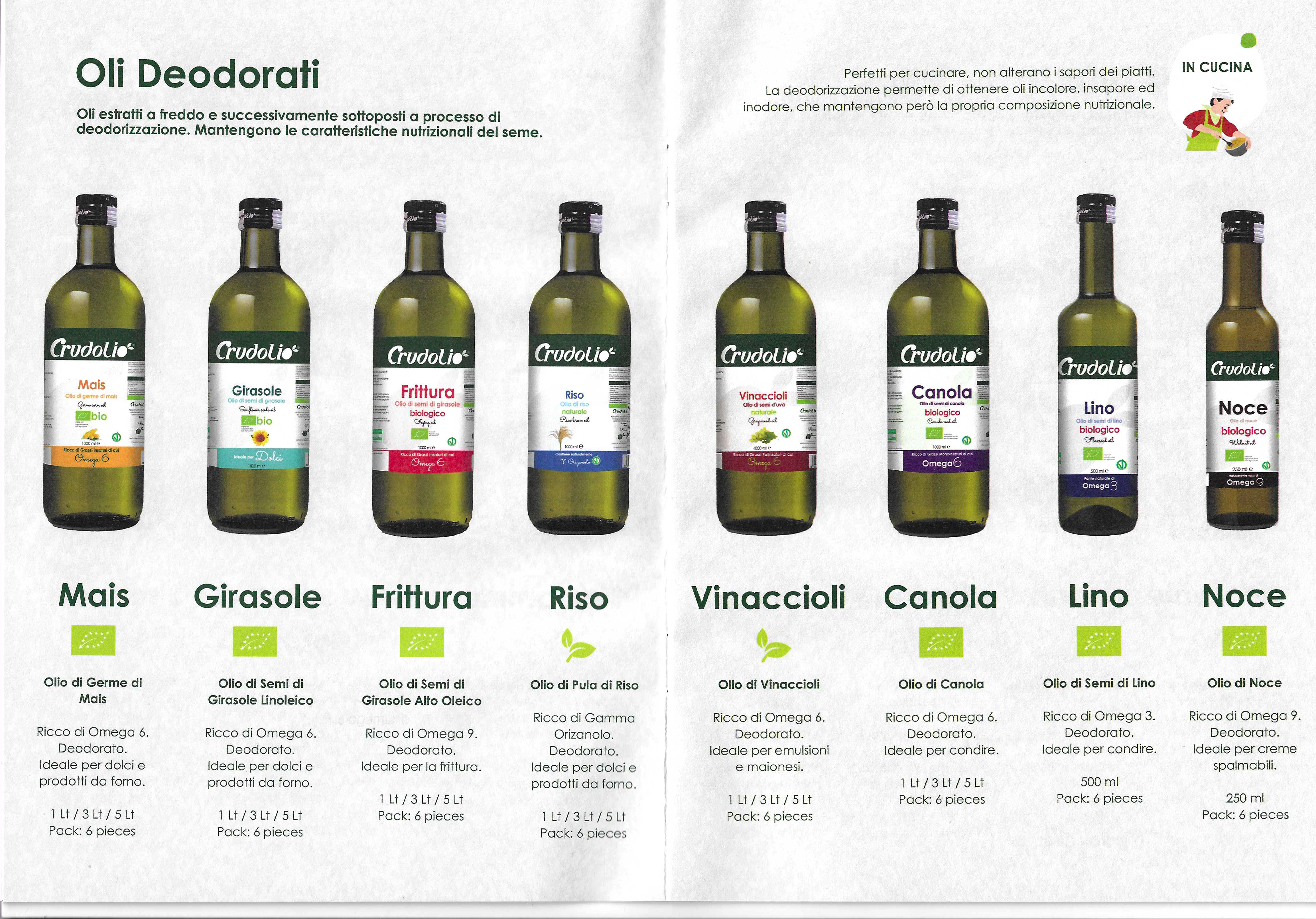Le immagini tratte dal catalogo mostrano ben 36 referenze di oli d’oliva e di semi, ciascuno destinato ad una propria funzione d’uso e a specifici target di consumatori.