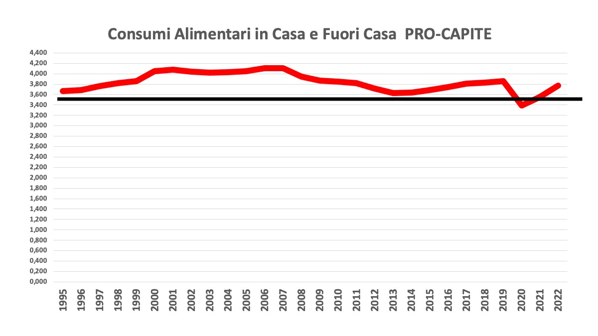 Osserviamo, infine, un ultimo grafico che traccia l’andamento del consumo totale di prodotti e di servizi alimentari PRO-CAPITE. La deduzione che ne traiamo è che l’allocazione del budget familiare per questa voce di consumo si è stabilizzata nel tempo con un progressivo spostamento verso il consumo fuori casa.
