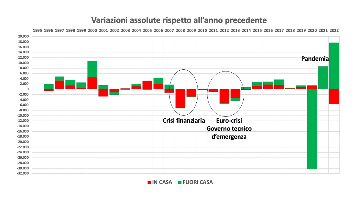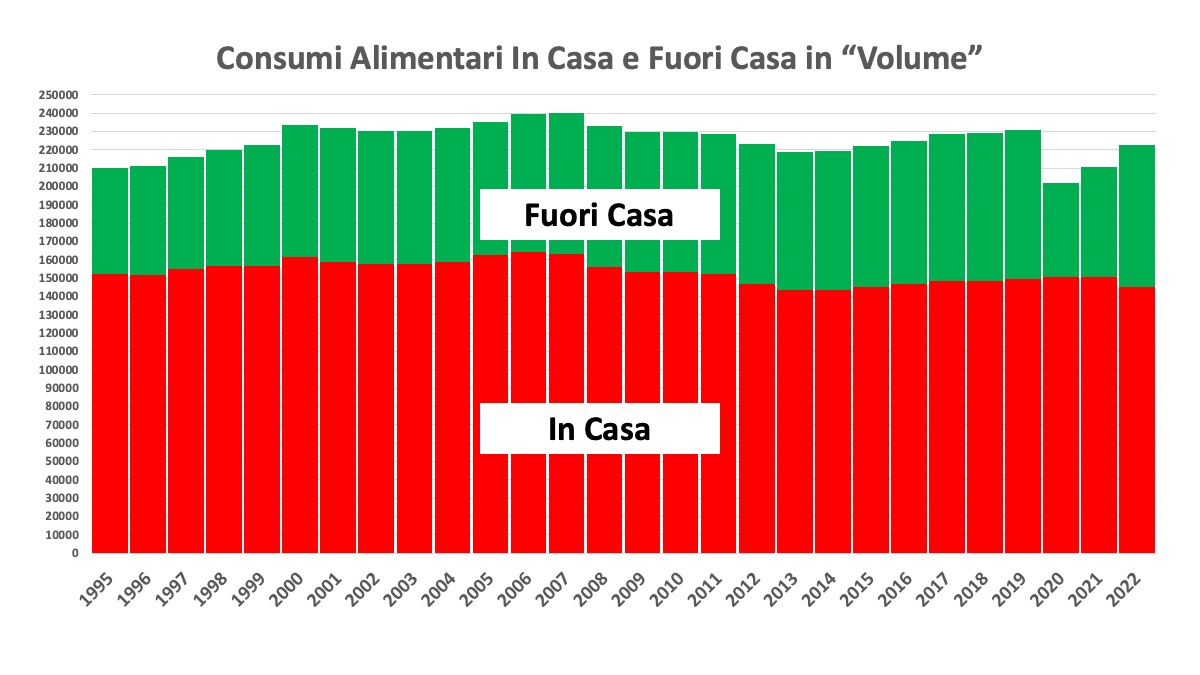 Dunque, l’ipotesi che stiano crollando i VOLUMI dei consumi alimentari attraverso la semplice relazione causale con il reddito in contrazione per l’inflazione subita, è, diciamo, semplicistica, naïf. Infatti, il consumo alimentare nella società odierna è, in primo luogo, inelastico ai prezzi e, in secondo luogo, si esplicita in due grandi ed eterogenee categorie: il consumo IN CASA e il consumo FUORI CASA.