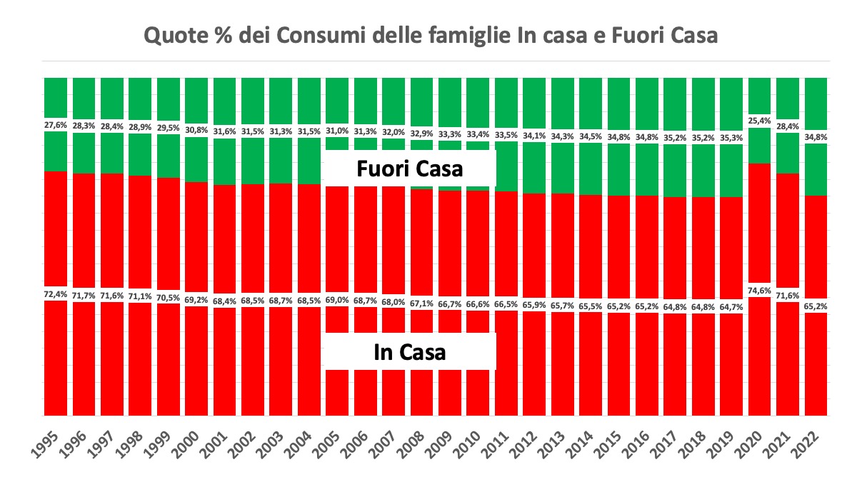 Va detto che i consumi fuori casa, comprendono il valore del servizio aggiunto alla materia prima lavorata, ma ai fini del mio ragionamento sui criteri di scelta e di decisione delle famiglie Italiane, trascuriamo il fatto.