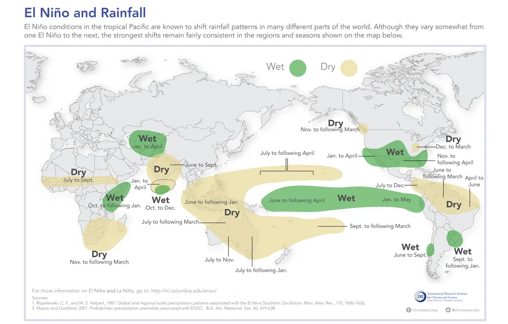 Durante El Niño, l’Oceano Pacifico si riscalda, il che può portare a cambiamenti nei flussi meteorologici di tutto il mondo. Questa inversione termica degli oceani può causare siccità in Australia, in Indonesia e in parti del Sud America. Può causare, allo stesso tempo,inondazioni negli Stati Uniti sudoccidentali e nell’Africa meridionale e soprattutto in varie parti dell’Asia.