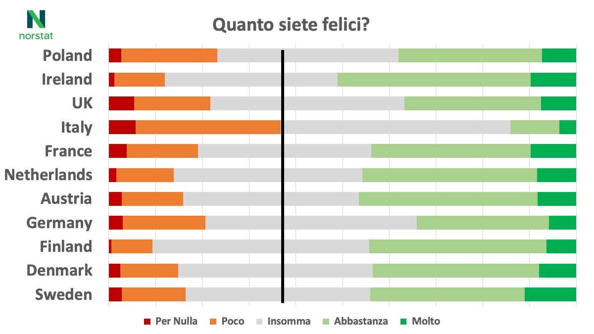 Sembra proprio di sì. “Chiagni e fotti” , uno dei pochi tratti che unificano la cultura popolare della penisola, appare evidenziarsi dalla recentissima ricerca Norstat sul mood di vari paesi europei. Oltre gli alti lai delle catene di supermercati, per l’inflazione a 2 cifre che sono costretti a trasferire ai loro clienti; oltre alle indagini stile Del Debbio nei mercatini sul rincaro delle patate, esiste l’arida realtà delle percentuali derivate dalle confessioni degli italiani presi alla sprovvista da indagini condotte professionalmente.