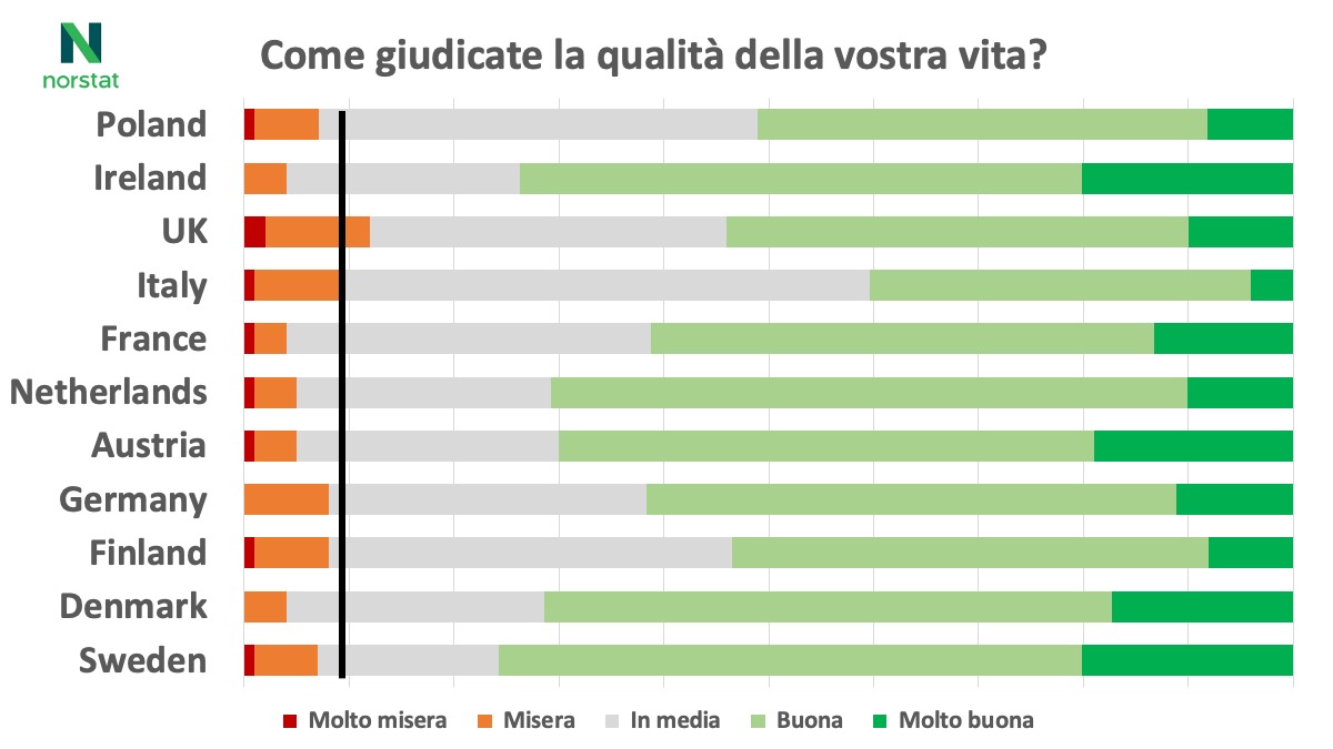 A parte il Regno Unito, che nonostante i fasti dell’incoronazione del nuovo re, dovrà abituarsi ad essere più povero, secondo le parole del Governatore della Banca d’Inghilterra, che proprio l’ultimo pirla non è, chi lamenta una qualità della vita misera o miserrima in Italia, in %, non è molto distante da Finlandia, Svezia, Germania, Polonia.
