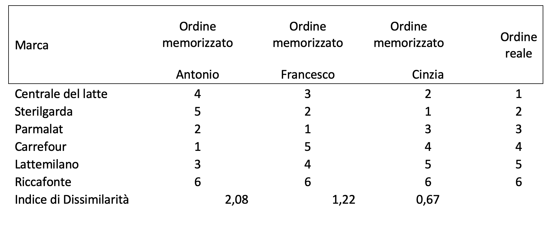 Tornato dai medesimi individui chiese loro di specificare il prezzo dei due prodotti da loro preferiti e poi, in base agli scarti rispetto ai prezzi reali, classificò i risultati in questo modo.