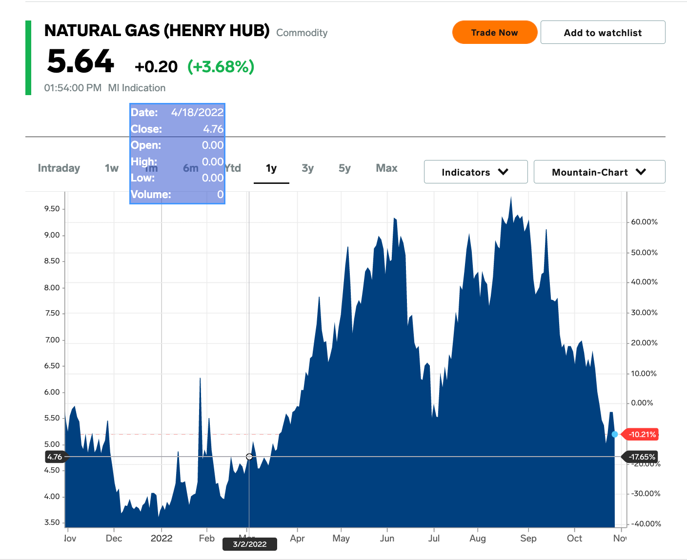 Tralasciando, allora, la spiegazione puerile delle oscure manovre speculative, il commercio internazionale delle materie prime energetiche risulta a breve termine imprevedibile, come dimostra il grafico del prezzo del gas a fine ottobre.