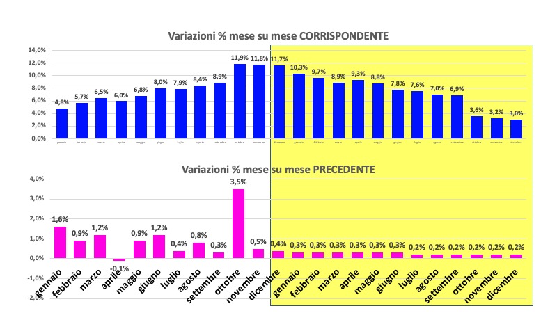 SE I PREZZI A GENNAIO 2023 RIMANESSERO FISSI, L’INFLAZIONE TENDENZIALE RIMARREBBE AL 10%.