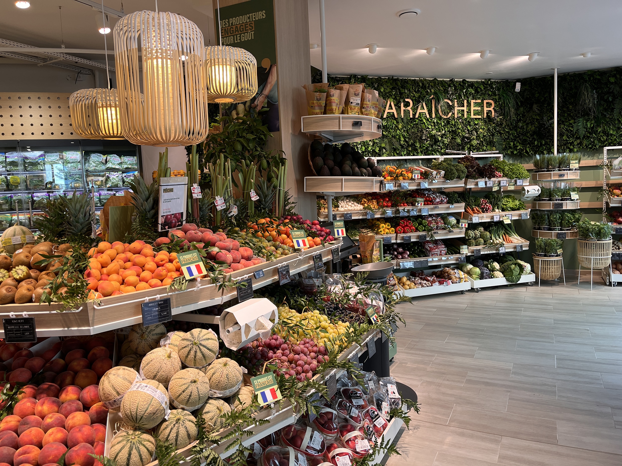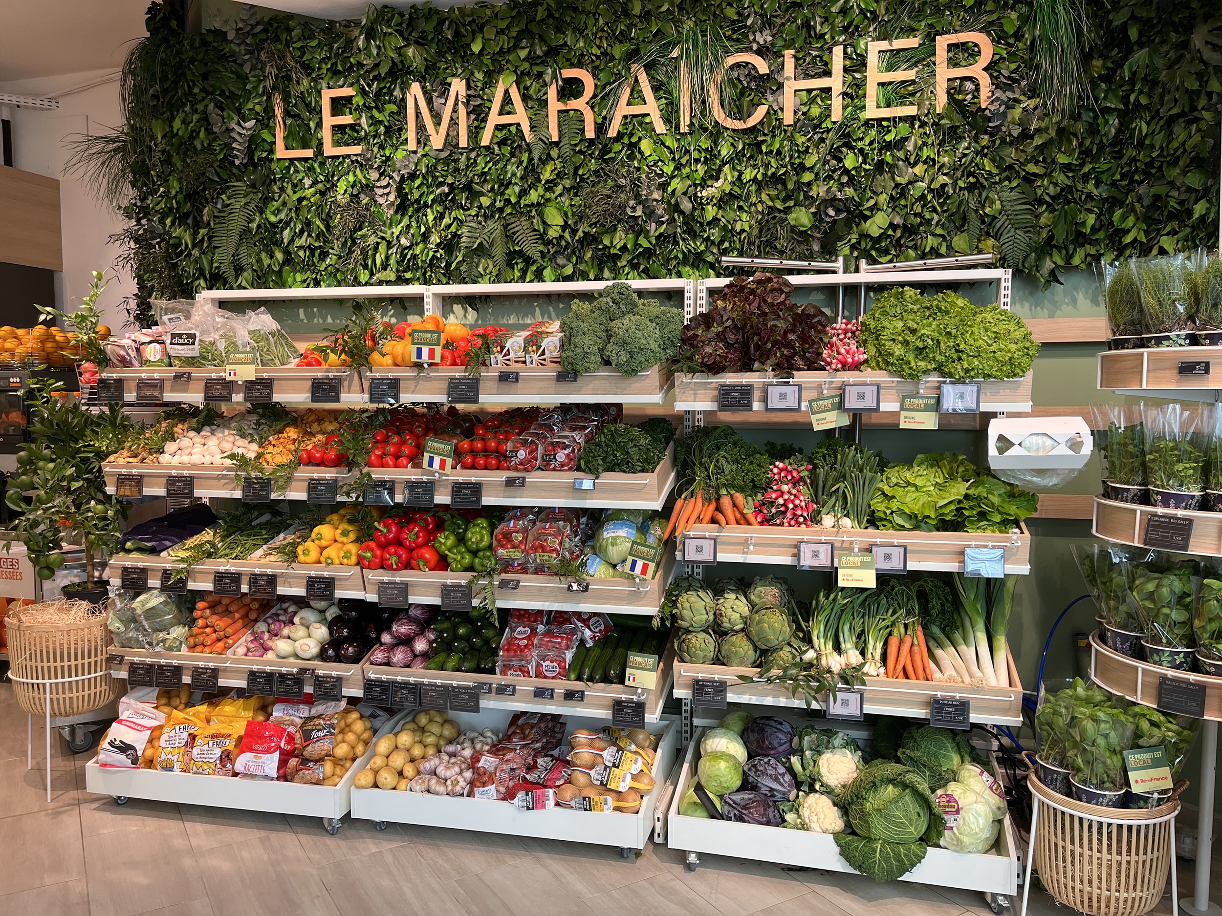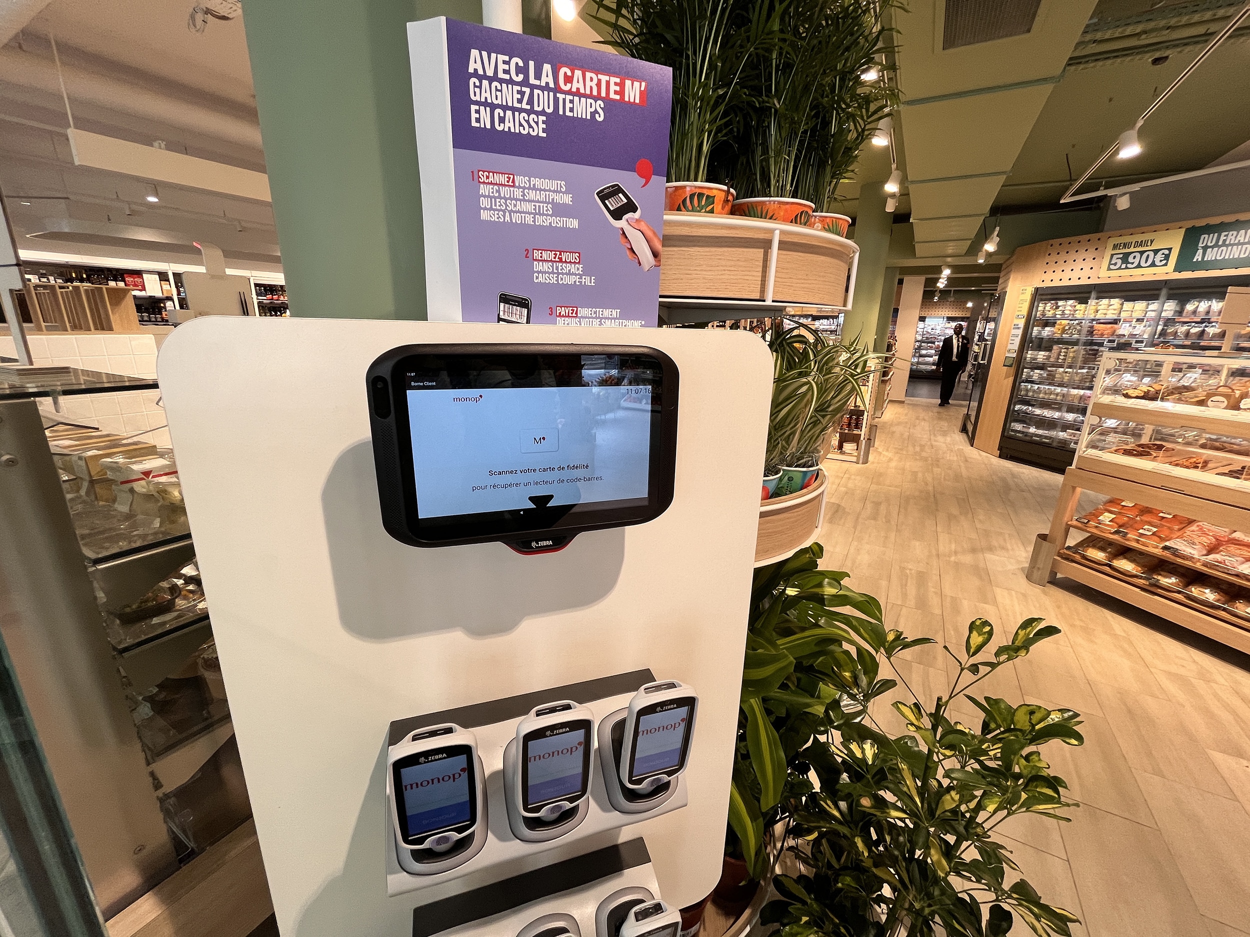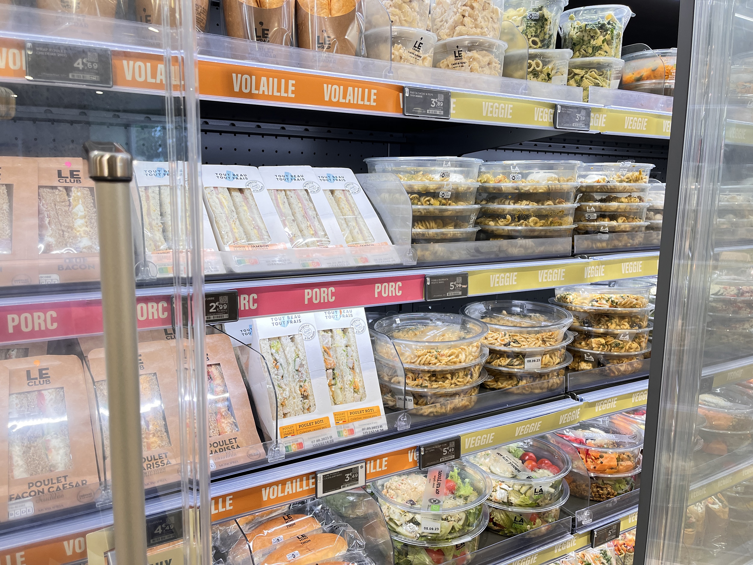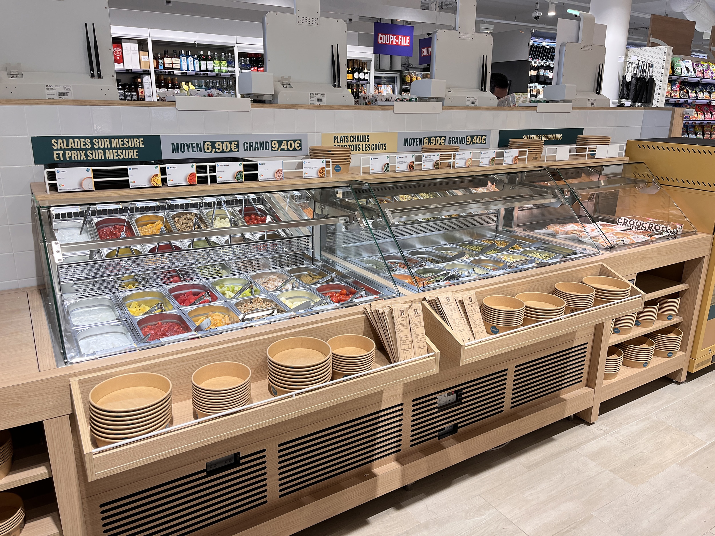 Sovrarappresentata tra dirigenti e famiglie single, la clientela locale è (un po’) meno sensibile all’inflazione e resta esigente nella richiesta di mangiare sano, buono, fresco, veloce e “facile”. Ciò ha portato Monop’ a raddoppiare l’assortimento di frutta e verdura (120 ref.) e a fornire con generosità un catering freschissimo (Kumo nel corner asiatico e sushi, Joli Coq per i piatti francesi, Mavromatis per il greco, ecc.), aggiunto al suo buffet di insalate fatte in casa, il tutto mescolando freddo e caldo. All’ingresso, questo punto di vendita di soluzioni alimentari si rivela altrettanto impressionante quanto  il ridimensionamento di Monop’  del fresco tradizionale: macelleria e “sous at” che condividono un unico elemento, nella parte retrostante del negozio. La spiegazione (puramente locale) è la concorrenza vicina dei mercati coperti di Levallois.