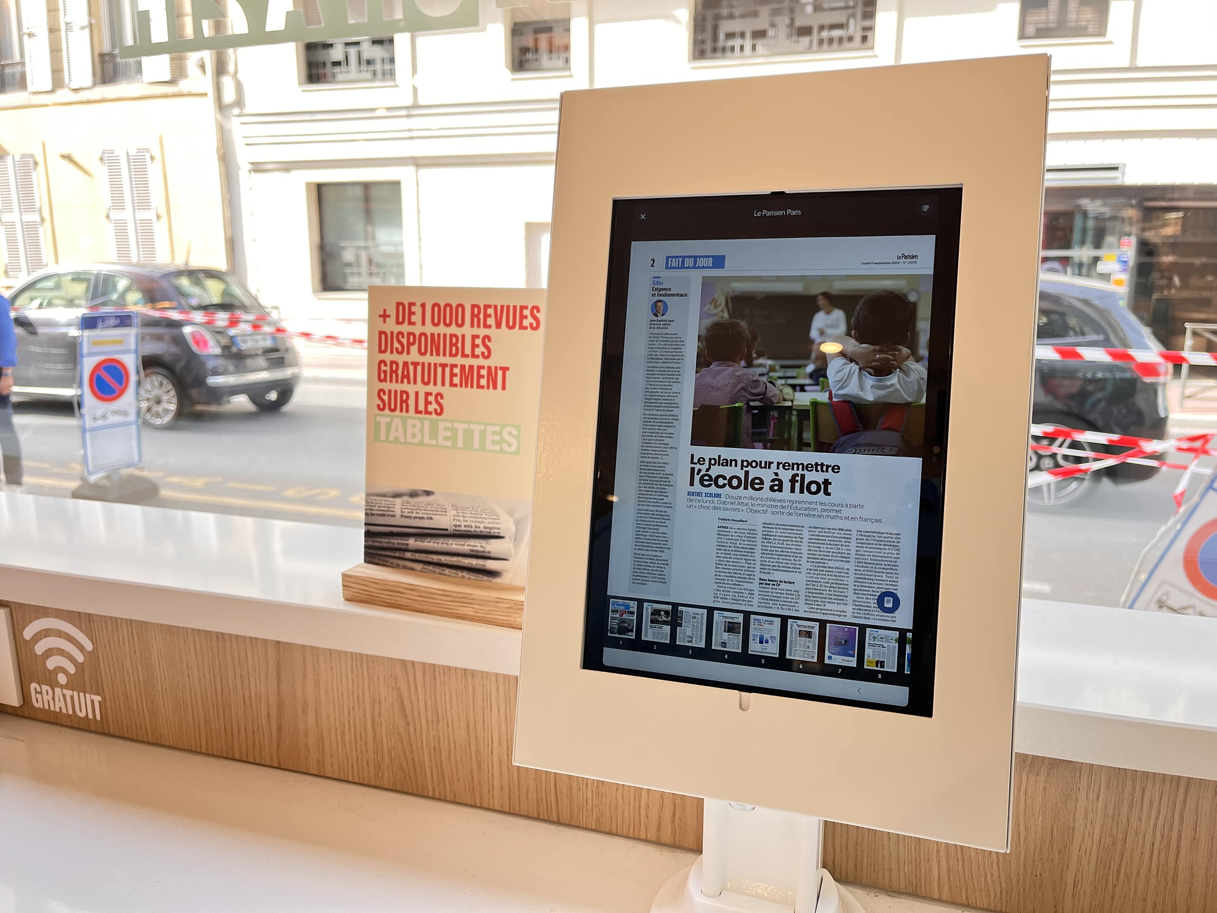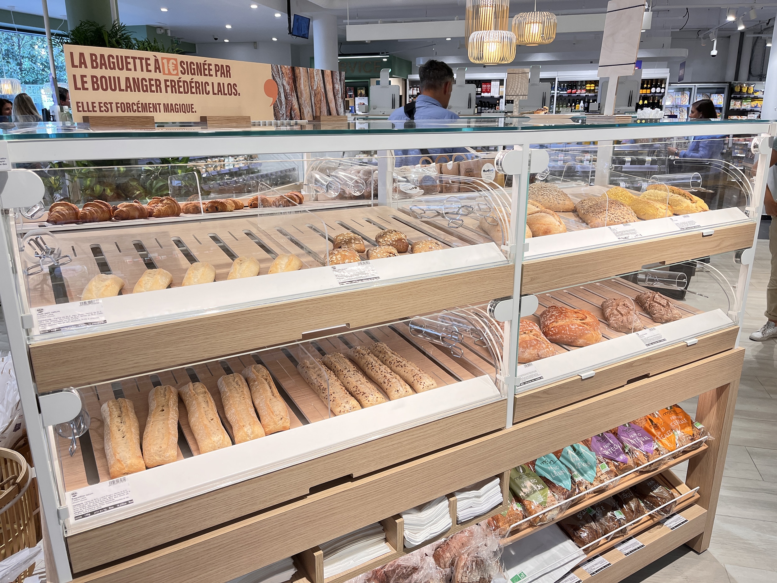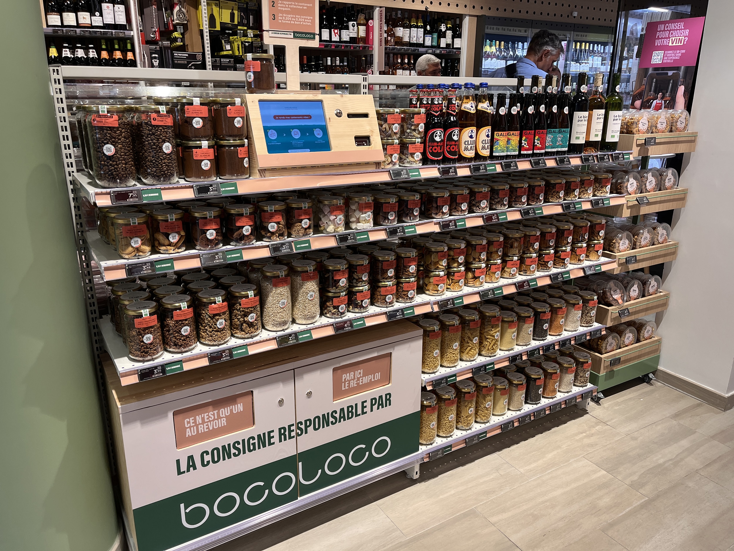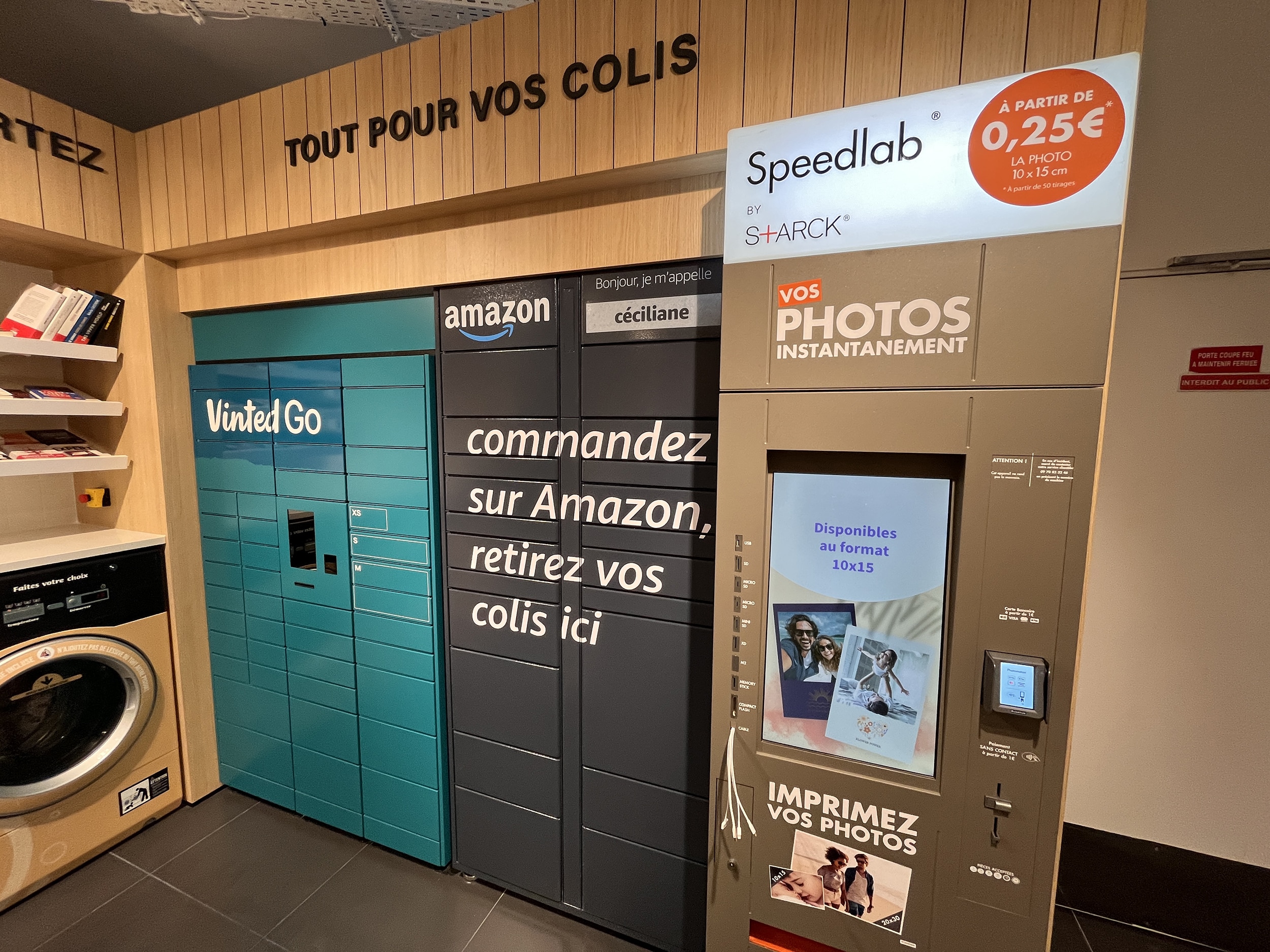 Lavatrice e asciugatrice sono a disposizione nel retro del negozio, accanto ai locker Vinted e Amazon: si paga direttamente con la carta di credito e la macchina invia un SMS a fine lavaggio. Alla cassa, il cliente può prendere in prestito una quindicina di oggetti di uso poco frequente: trapano, macchina per raclette, ecc. Una decina di posti sono riservati alla consumazione in loco, con la fornitura di tablet che propongono la stampa del giorno. Ultimo ma non meno importante  : le hand-self-scanning, che rimangono una rarità in un formato così piccolo.