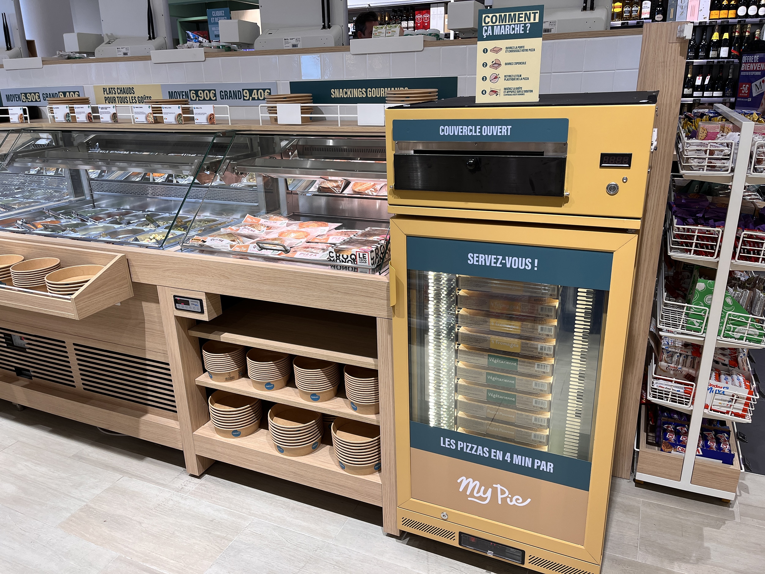 La ricerca di contenuto di servizio dei prodotti si traduce più ampiamente in una serie di iniziative “consumer centric”, come la mixology permanente TG (Trainer Guide) per la preparazione dei cocktail. Monop’ propone anche il forno per pizza self-service My Pie, già visto dai cugini di Franprix, che permette di riscaldare una pizza surgelata in 4’30 (per 4,50 euro). La soluzione (sbalorditiva) della start-up Graffiti – che ho presentato  qui in diretta dalla NRF di New York – si sviluppa in cantina per offrire un sommelier virtuale su smartphone.